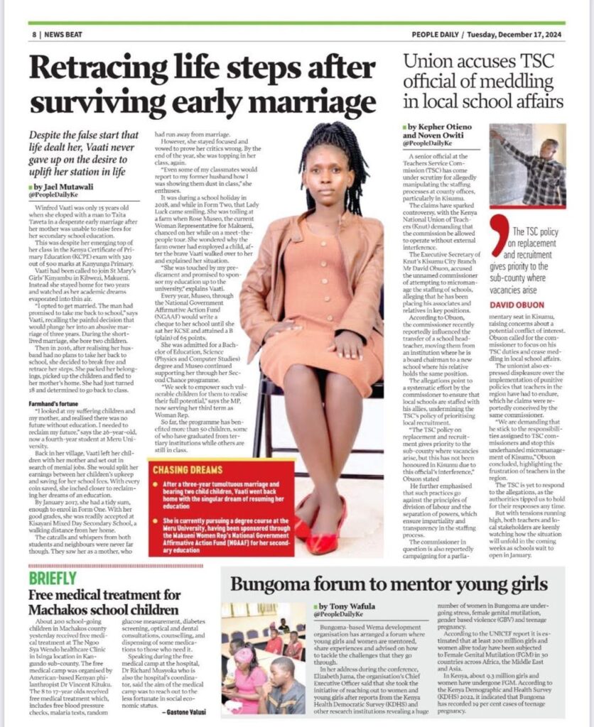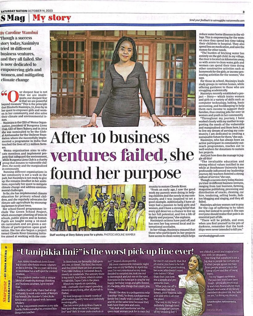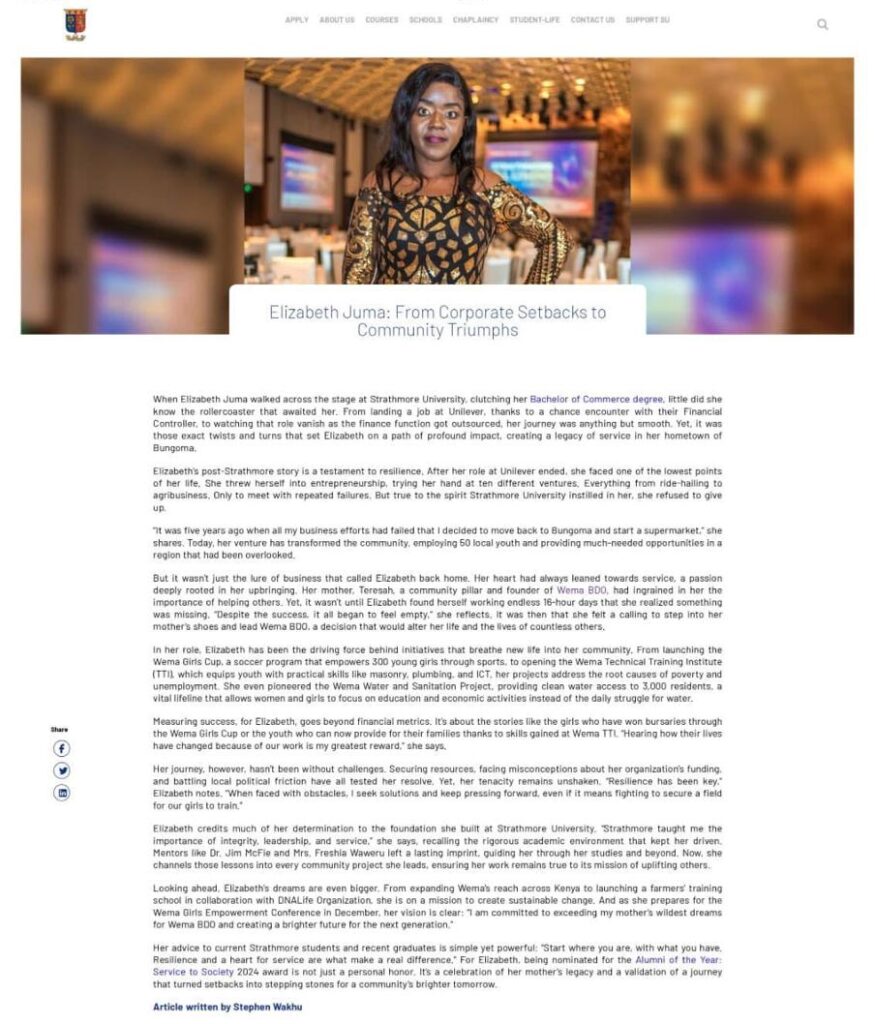 Newspapers and Articles Strathmore University: From Corporate Setbacks to Community Triumphs Local Newspaper(Daily Nation) features Liz's enterpreneurship story. Prime Africa Sport: Footballl empowers Bungoma Girls Sulwe FM hosts ELizabeth for a talk on women empowerment CountySplash: Wema BDO holds forum to mentor young girls Video Gallery Media Appearances